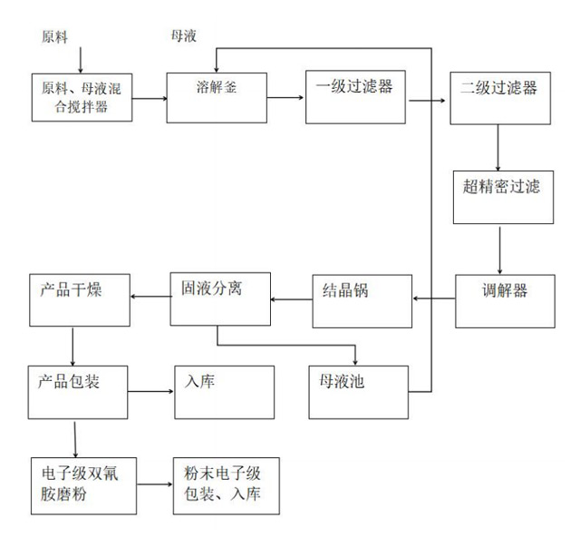 將母液或軟化水打入投料攪拌器,按照比例投入雙氰胺,經(jīng)泵打入溶解釜,升溫充分溶解后,放入溶解液儲(chǔ)罐后經(jīng)泵打入一級(jí)過(guò)濾器,過(guò)濾液進(jìn)入一級(jí)濾液儲(chǔ)罐,再經(jīng)泵打入二級(jí)過(guò)濾器,進(jìn)行精密過(guò)濾,濾液經(jīng)精密過(guò)濾器出口再經(jīng)超精密過(guò)濾器打入結(jié)晶鍋中結(jié)晶,冷卻結(jié)晶后由結(jié)晶鍋放出,經(jīng)離心機(jī)進(jìn)行固液分離,分離后的濕結(jié)晶體經(jīng)螺旋機(jī)送入燥機(jī)干燥,干燥后的成品,稱量、包裝。